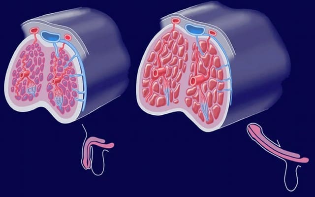 El pene aumenta de tamaño durante la erección debido a que se llena de sangre. Para ello, 2 grandes vasos sanguíneos (flechas en la imagen) se aproximan al pene.